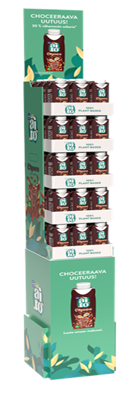 ![]() | Oat Drink Display Stand – Adara Pakkaus /Finland Designed as both transport and display packaging without excess material and empty space. Clever way to use the top part as a stand. Easy to assemble. |